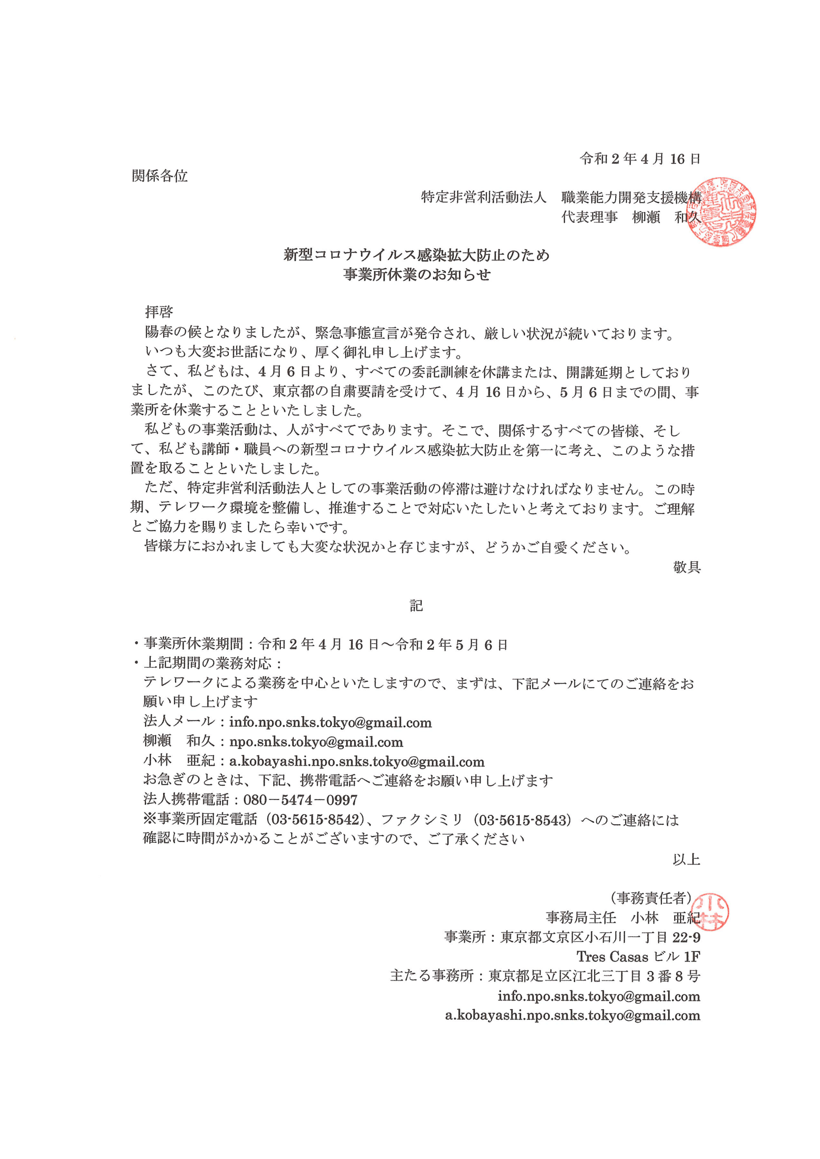 新型コロナウイルス感染拡大防止のため 事業所休業のお知らせ