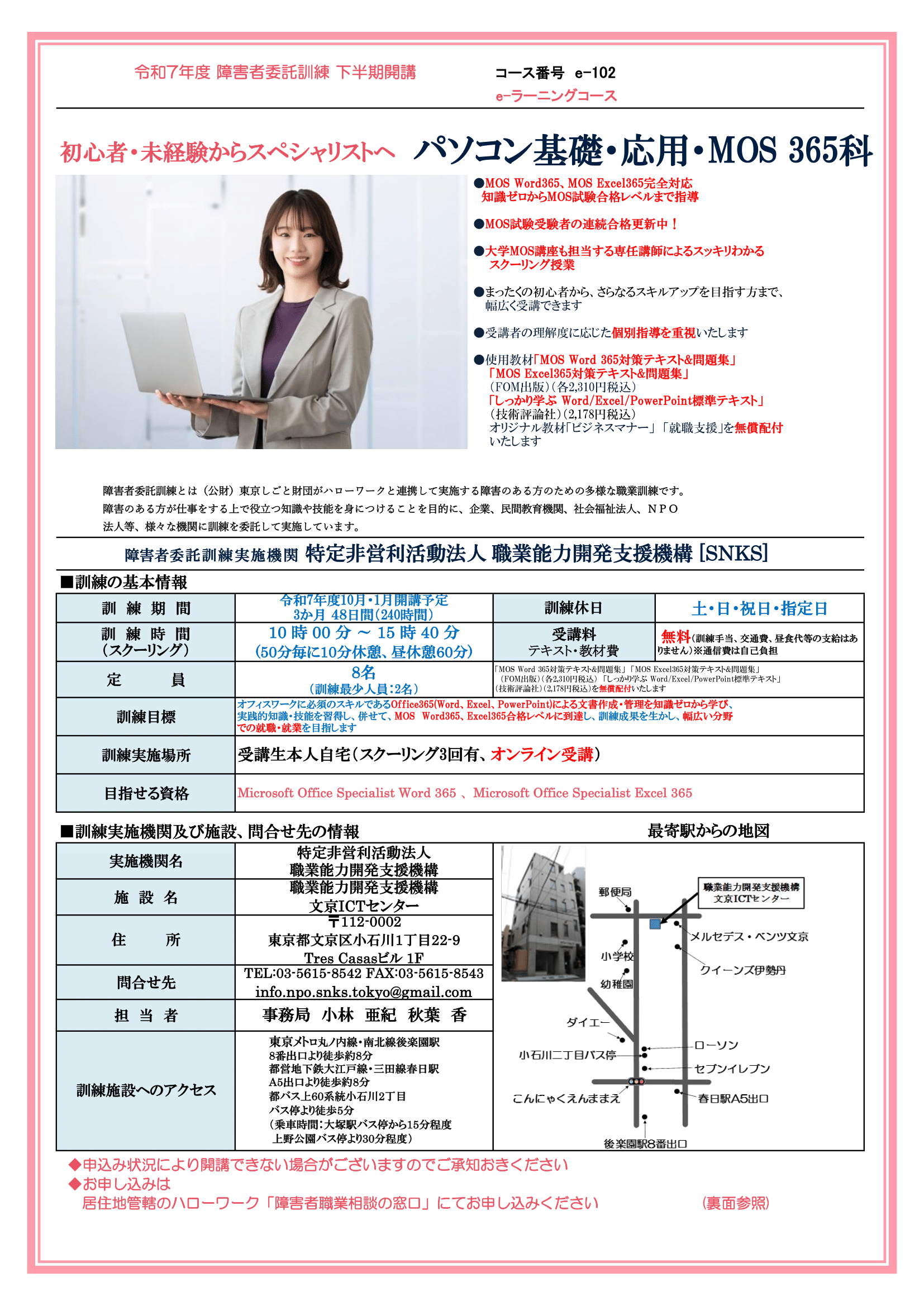 NEW!教材パワーアップ 令和7年度下半期10月開講受講生募集中 e-ラーニングコース 初心者・未経験から スペシャリストへ! パソコン基礎・応用・MOS365科 東京しごと財団障害者委託訓練