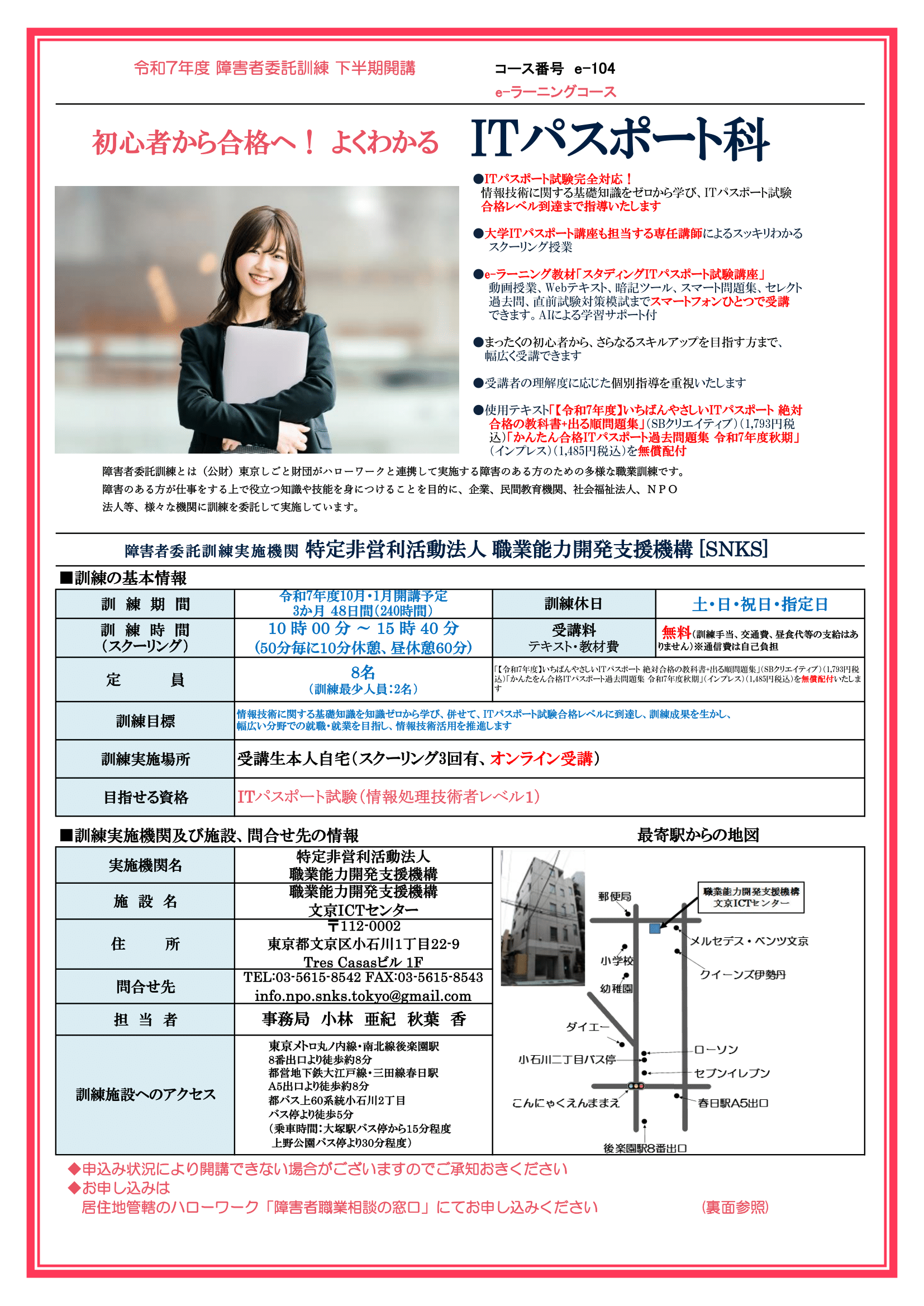 NEW!教材パワーアップ 令和7年度下半期10月開講受講生募集中 e-ラーニングコース "初心者から合格へ!" よくわかる ITパスポート科 東京しごと財団障害者委託訓練