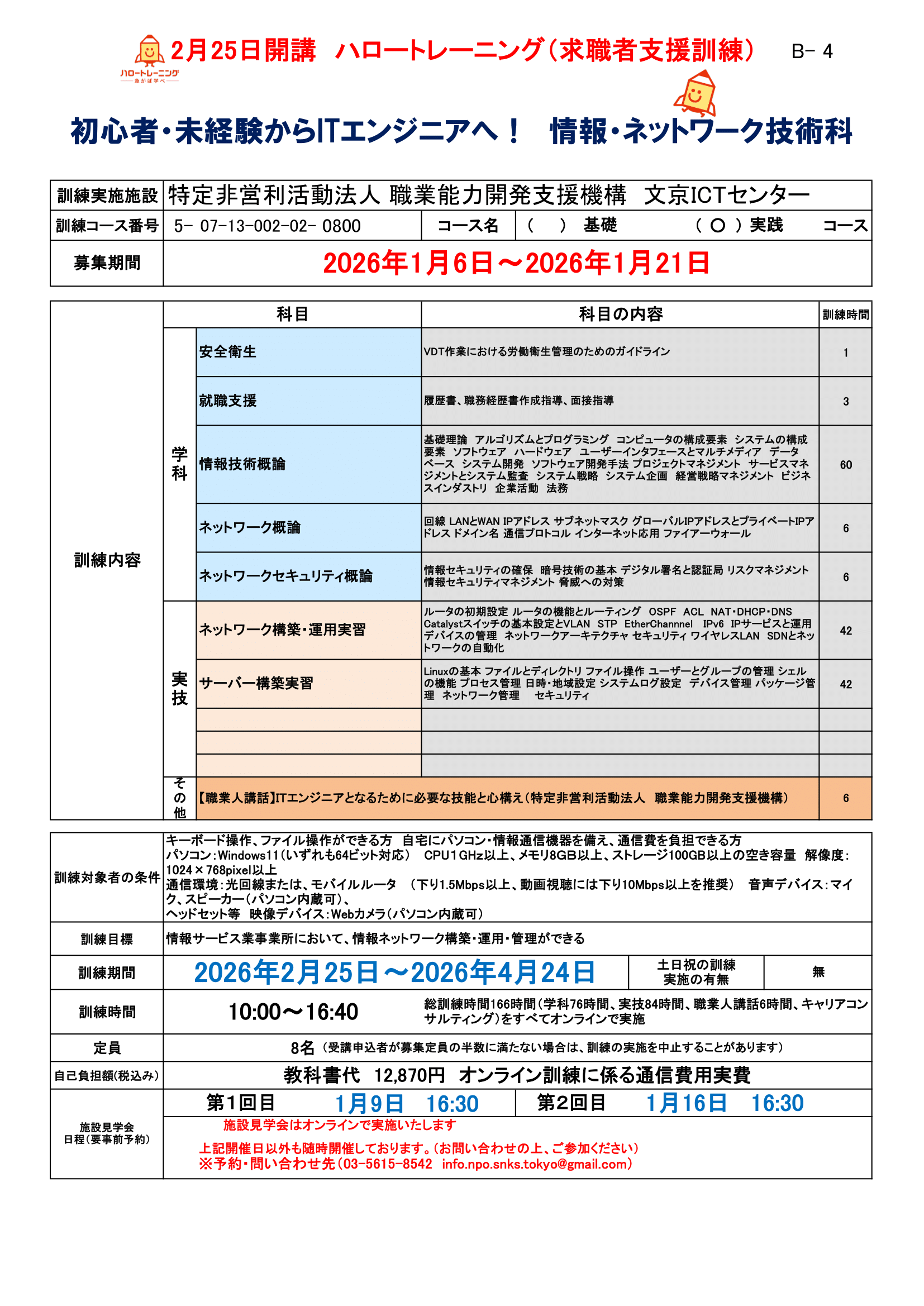 NEW!新設コース 令和8年2月25日開講受講生募集中 募集期間:1月6日~1月21日 初心者・未経験から ITエンジニアへ! 情報・ネットワーク技術科